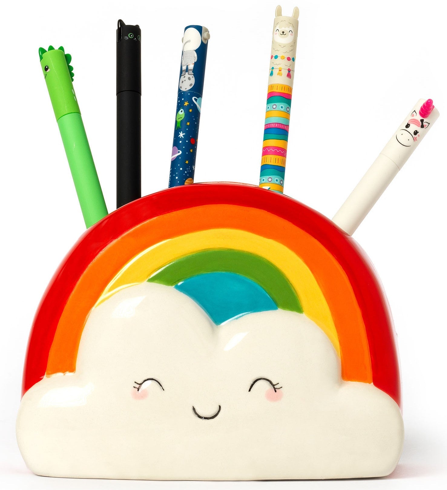 Penneholderne er en morsom og unik måte å oppbevare penner og blyanter på. Den er laget av høykvalitets keramikk og har en detaljert og fargerik design som ligner på en regnbue.
