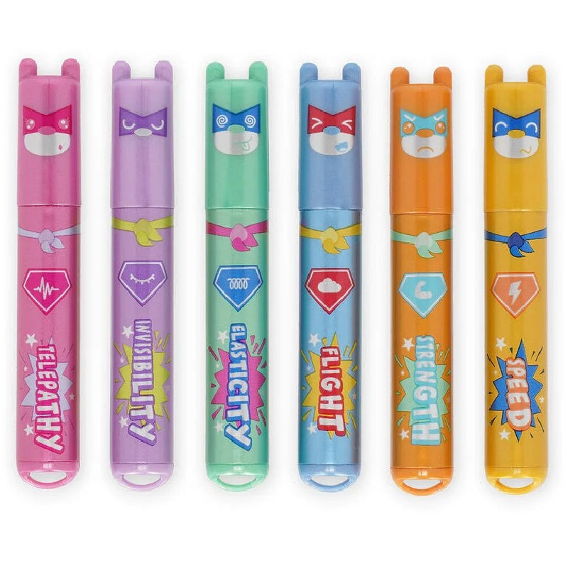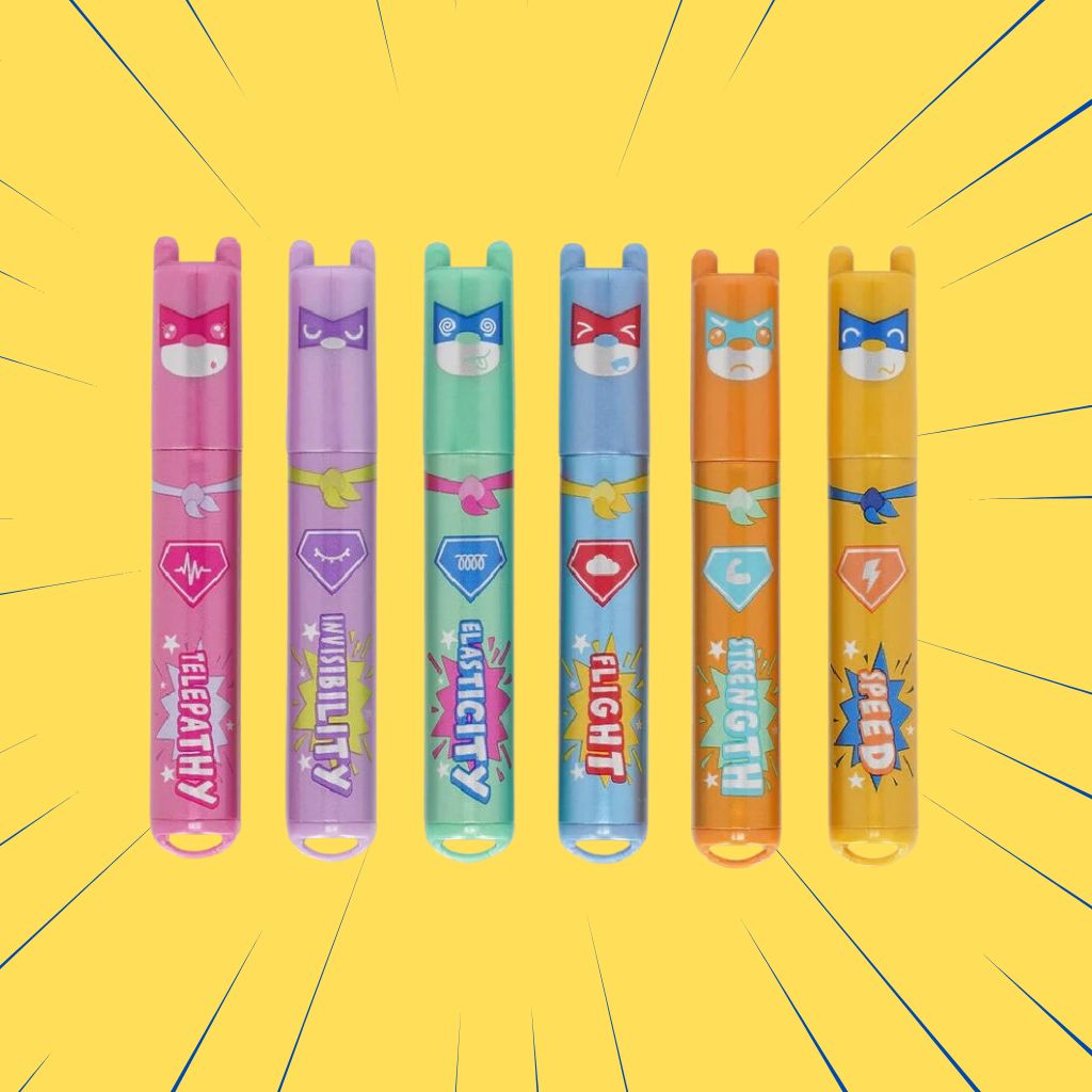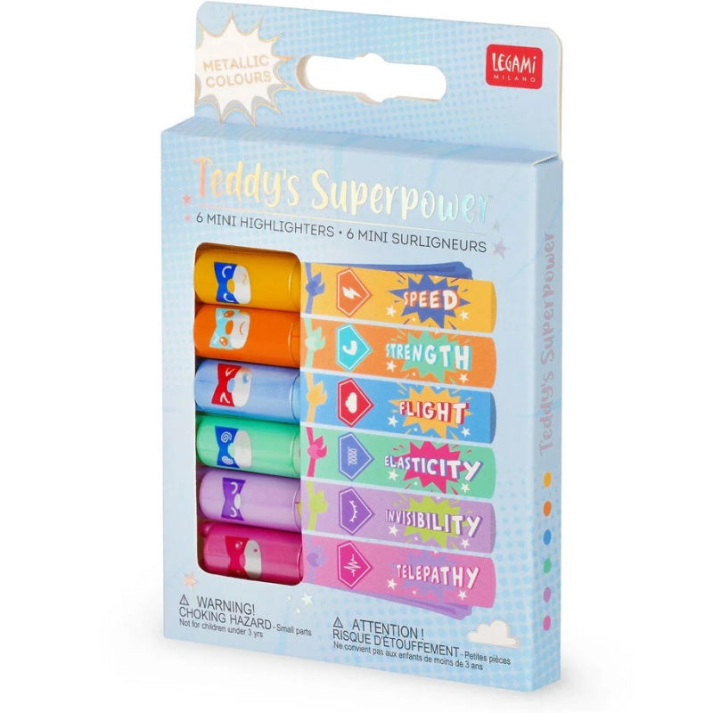 Har du behov for å holde orden på de viktigste notatene dine? Frykt ikke: dine superfargerike superhelter er her! Settet med 6 mini highlightere - Teddy's Superpower fra Legami består av et team av seks maskerte teddy-bjørner i seks forskjellige metalliske farger. Disse highlighterne har kraften til å gjøre hver oppgave, enten det er på skole eller jobb, til en suksess!