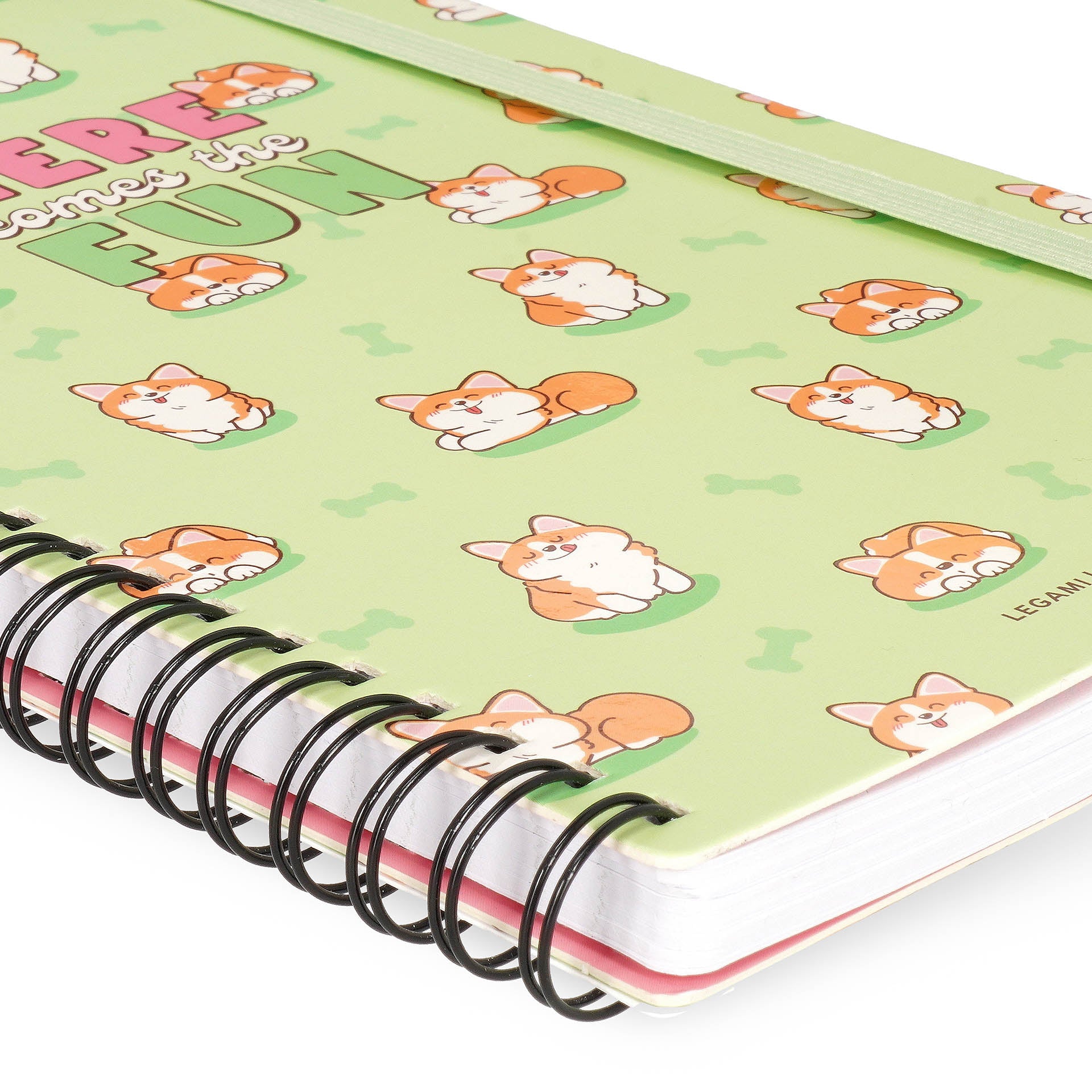 Denne lekne spiralnotatboken fra Legami er full av glade Corgier og positiv energi – med teksten HERE comes the FUN på forsiden i morsom typografi.